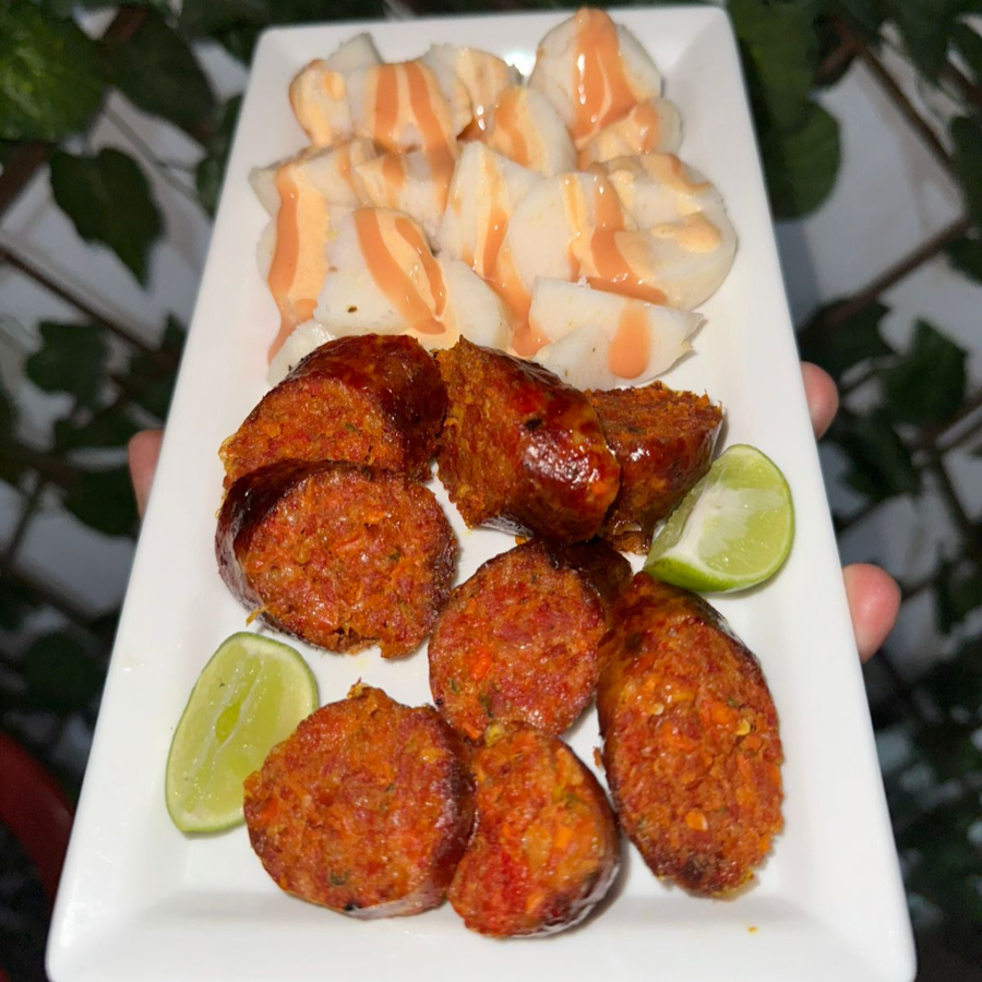 Pulpa de Cerdo, pechuga, chorizo, butifarra, maíz y mozzarella, queso costeño, papa chongo y salsa tártara.