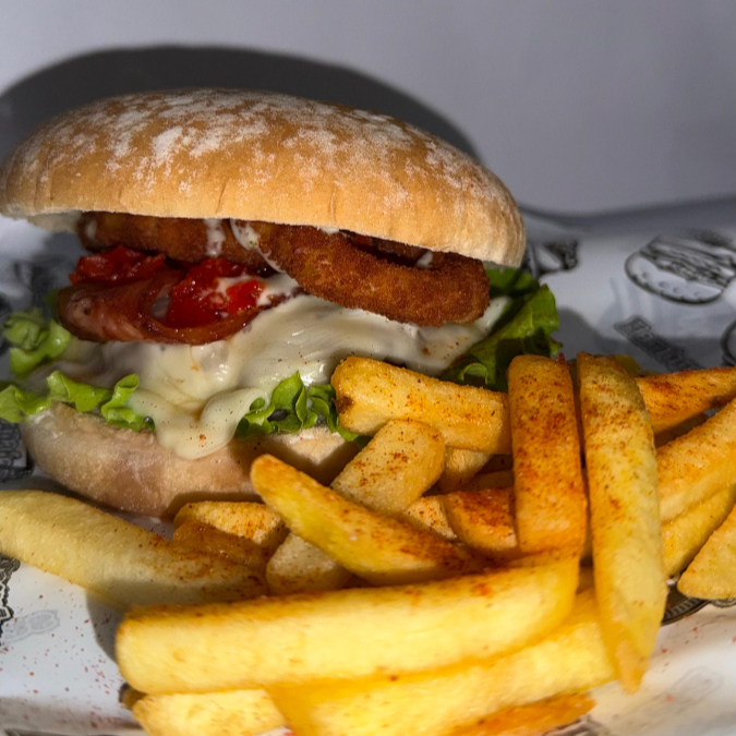 120 g Carne de res y 120 g de pechuga de pollo, chedar, aros de cebolla, Tocineta