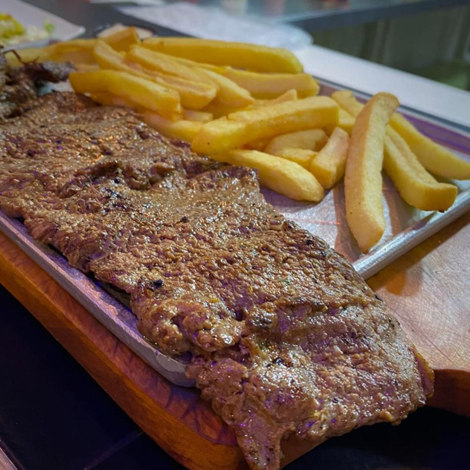 180 g Lomo ancho, 180 g de pechuga, chorizo y butifarra acompañado de papas a la francesa.