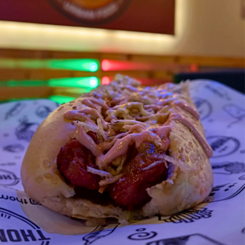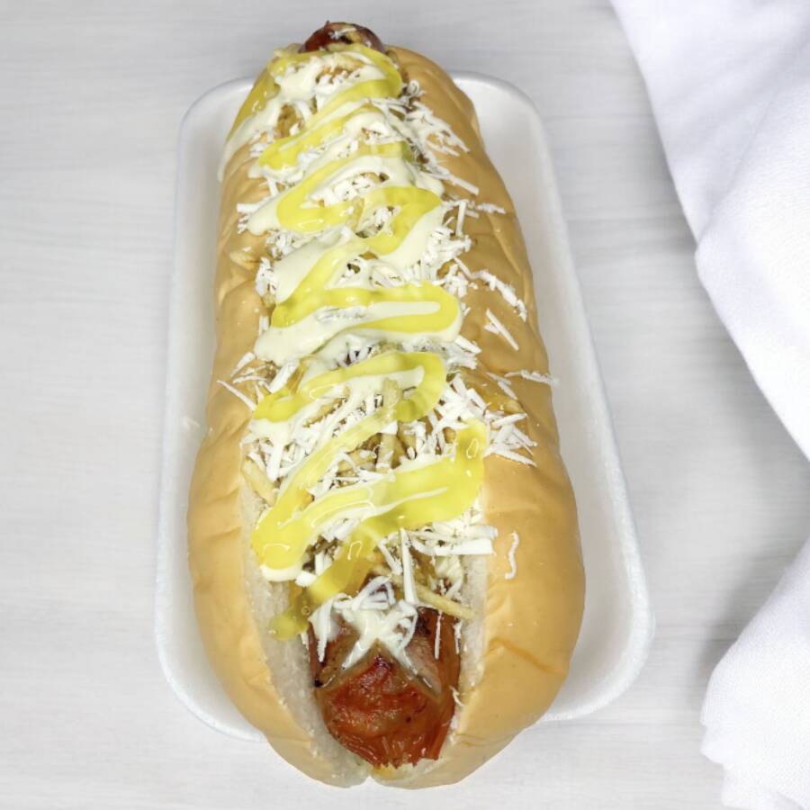 Pan artesanal, salchicha americana, queso costeño, lechuga, salsas de la casa y salsa de piña.