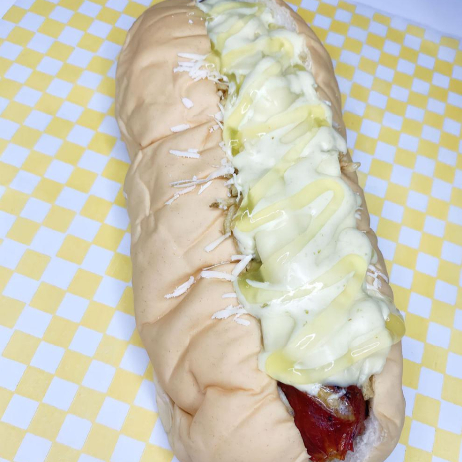 Pan artesanal, salchicha suiza, queso costeño, lechuga, salsas de la casa y pollo desmenuzado.