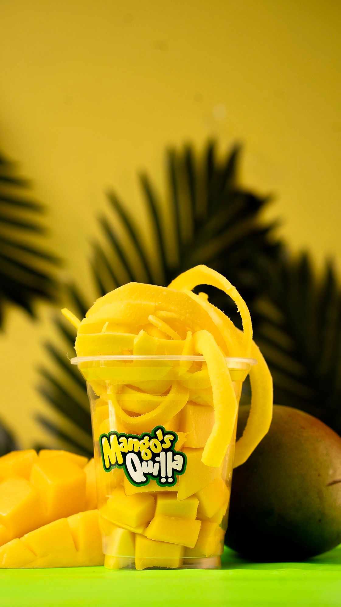 400 g De mango en tiras, vaso de 12 oz y tapa domo. Toppings: sal, pimienta, limón y tajín.