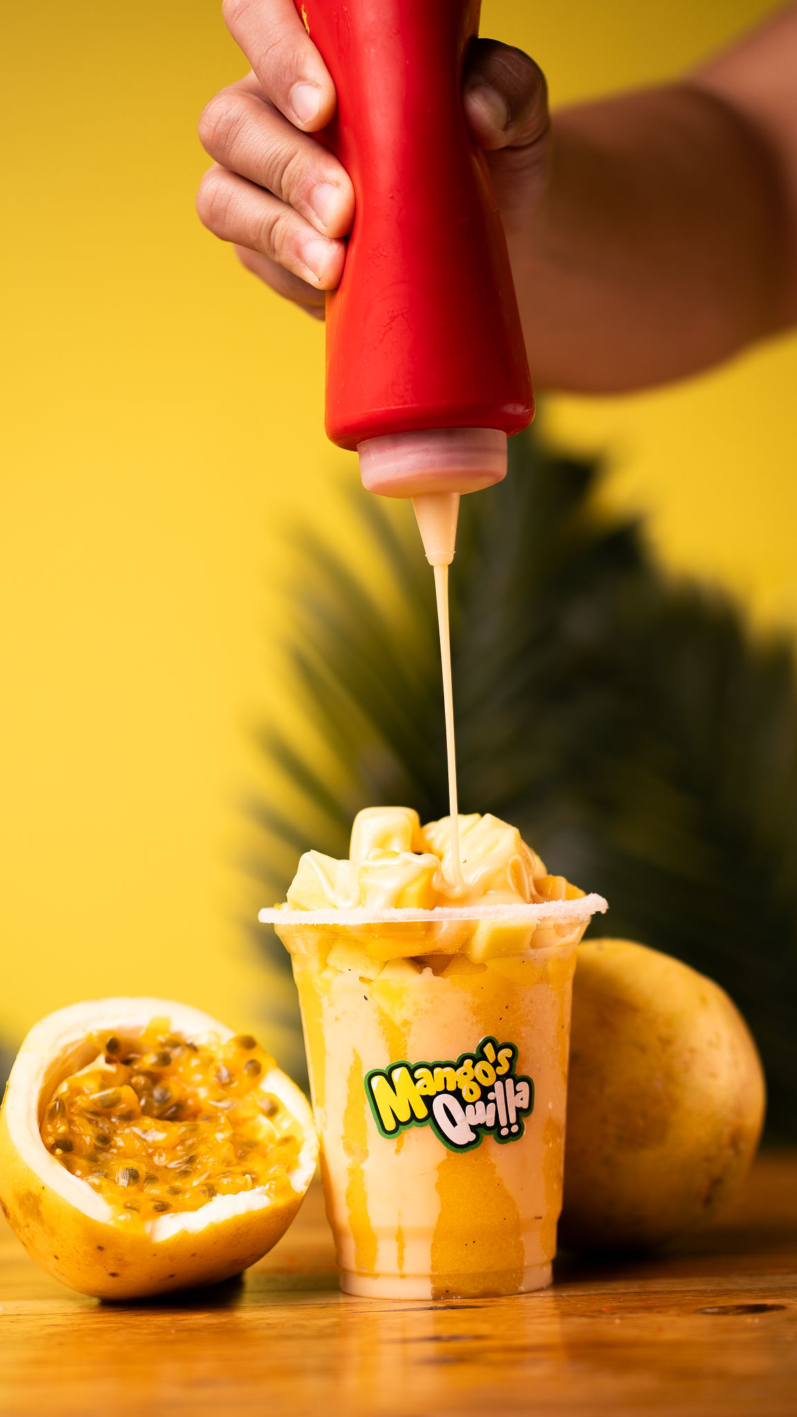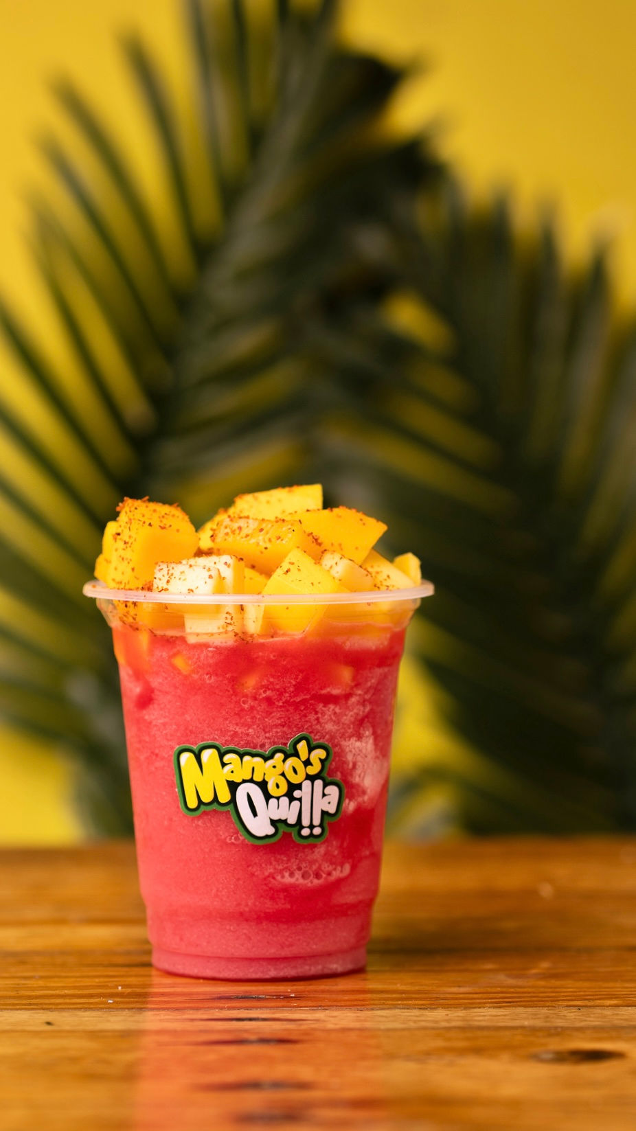 Delicioso granizado de mango y maracuyá 100% puro, acompañado de leche condensada, sal, pimienta, limón, y tajín a elección.