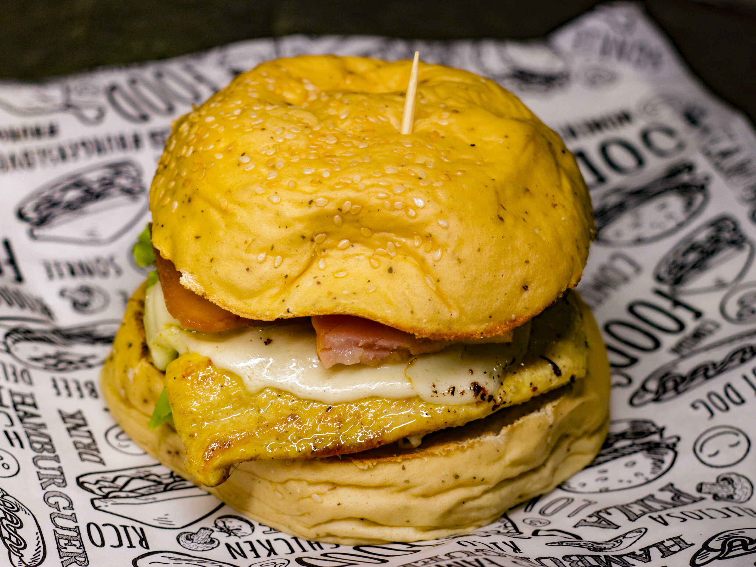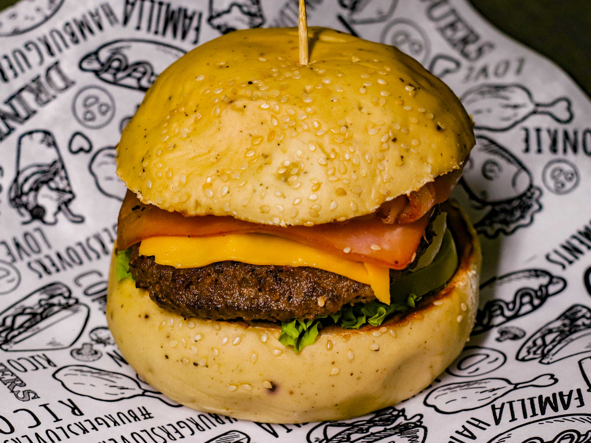Pan, doble carne, tomate, cebolla, lechuga, queso mozzarella, tocineta y salsa de la casa.