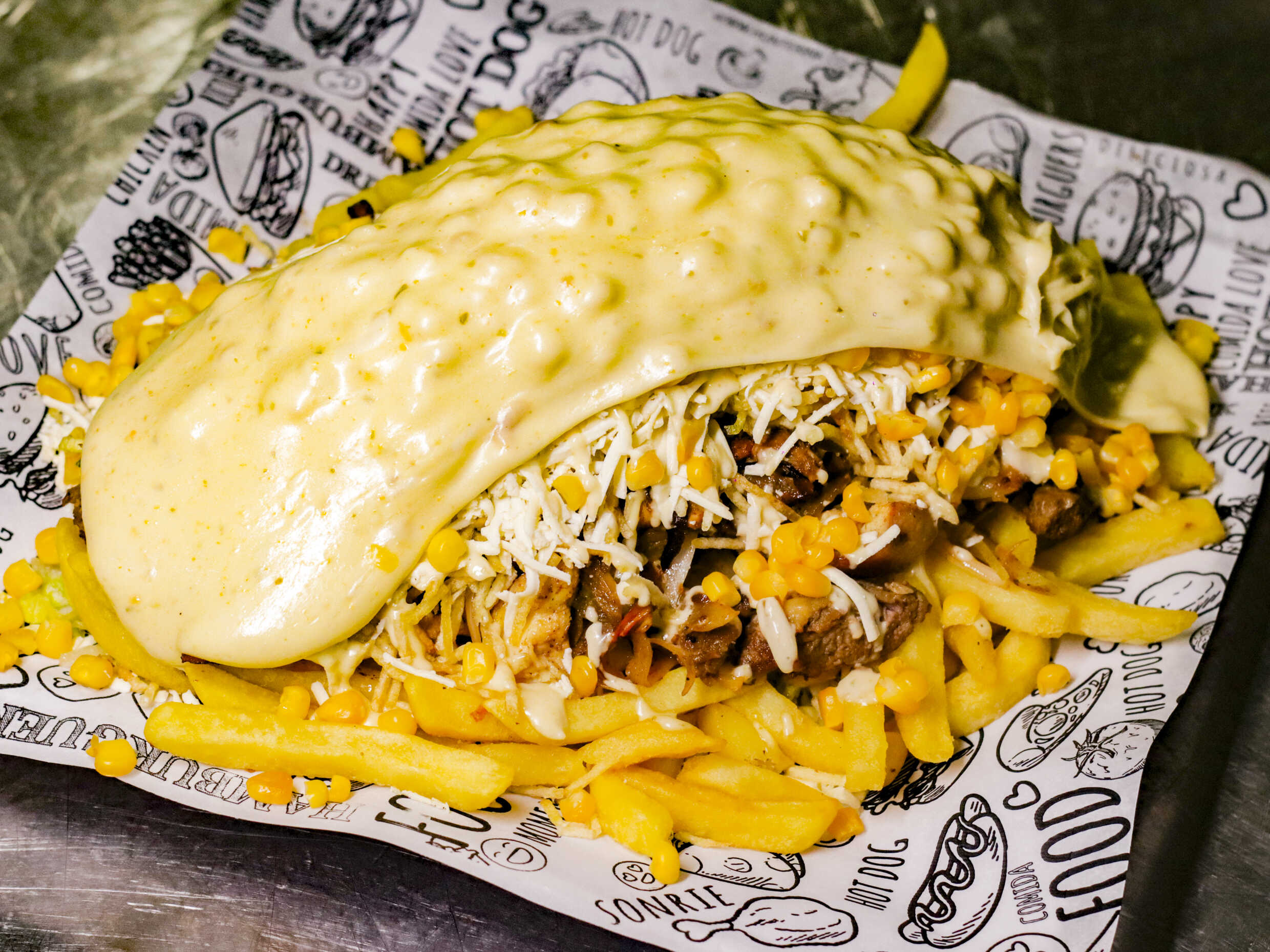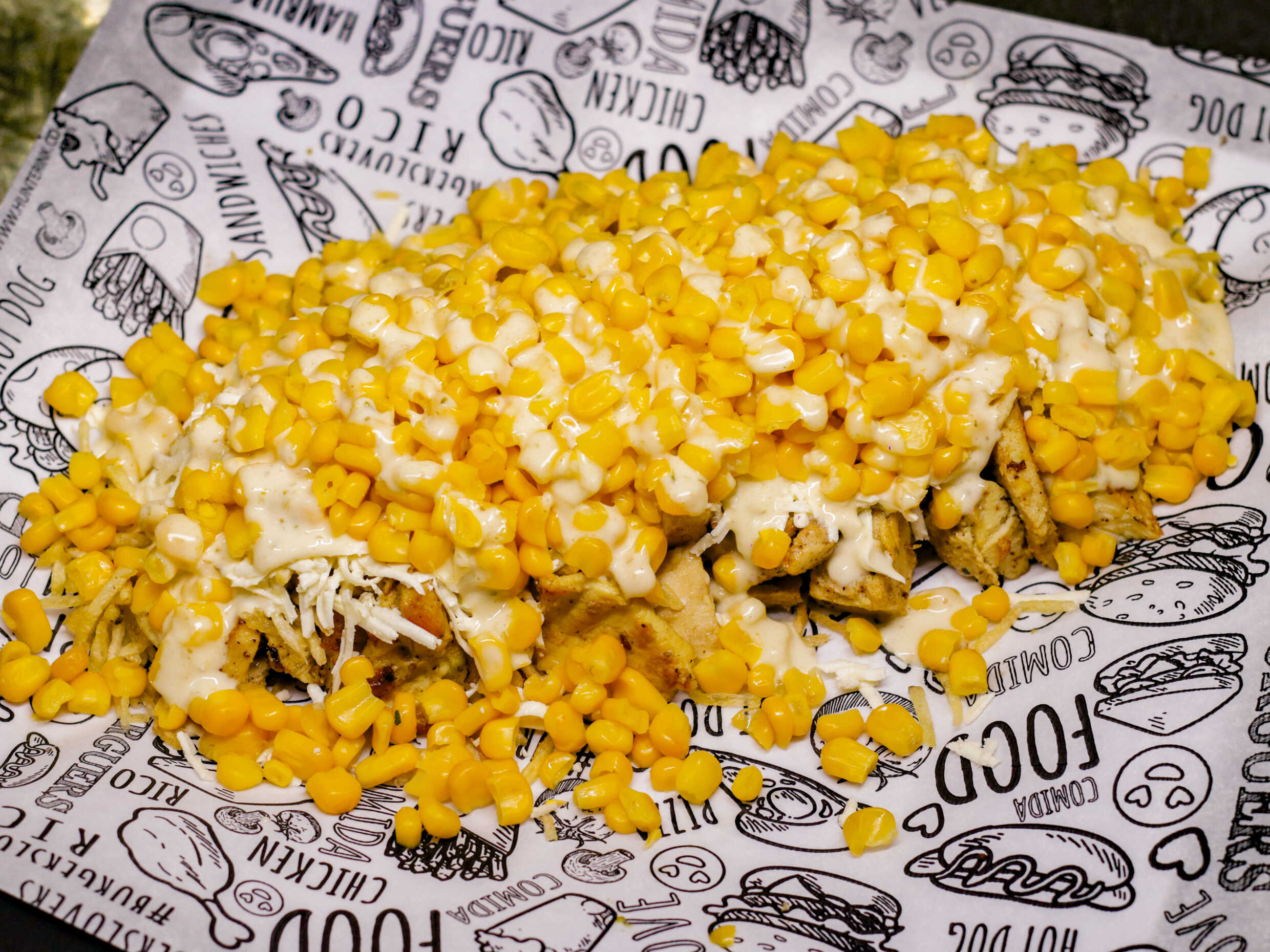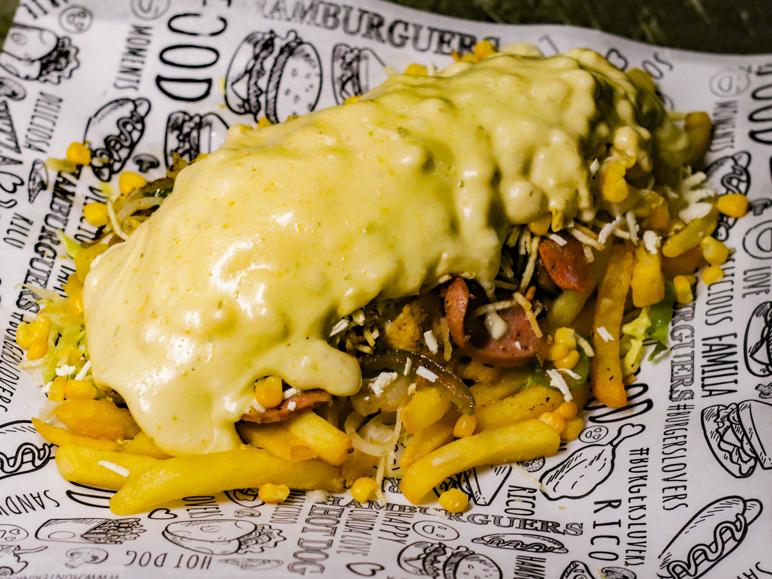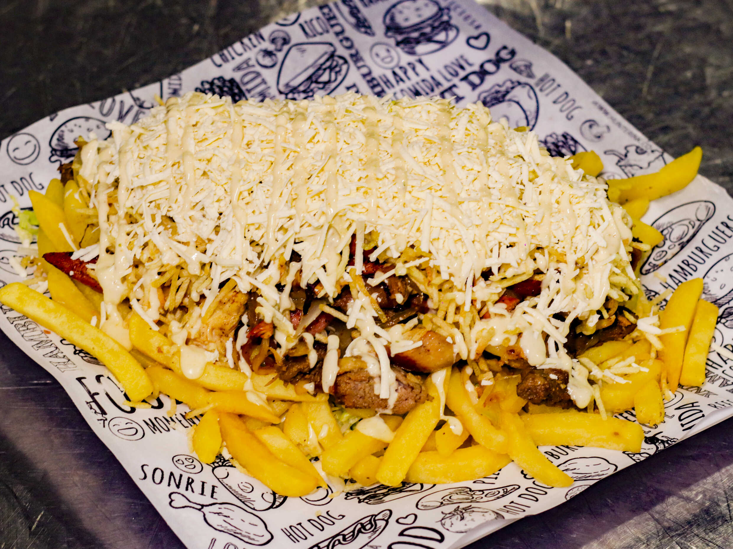 Papas a la francesa, papa chongo, pollo, carne, chorizo, butifarra, queso, piña o tártara, queso fundido y maíz.