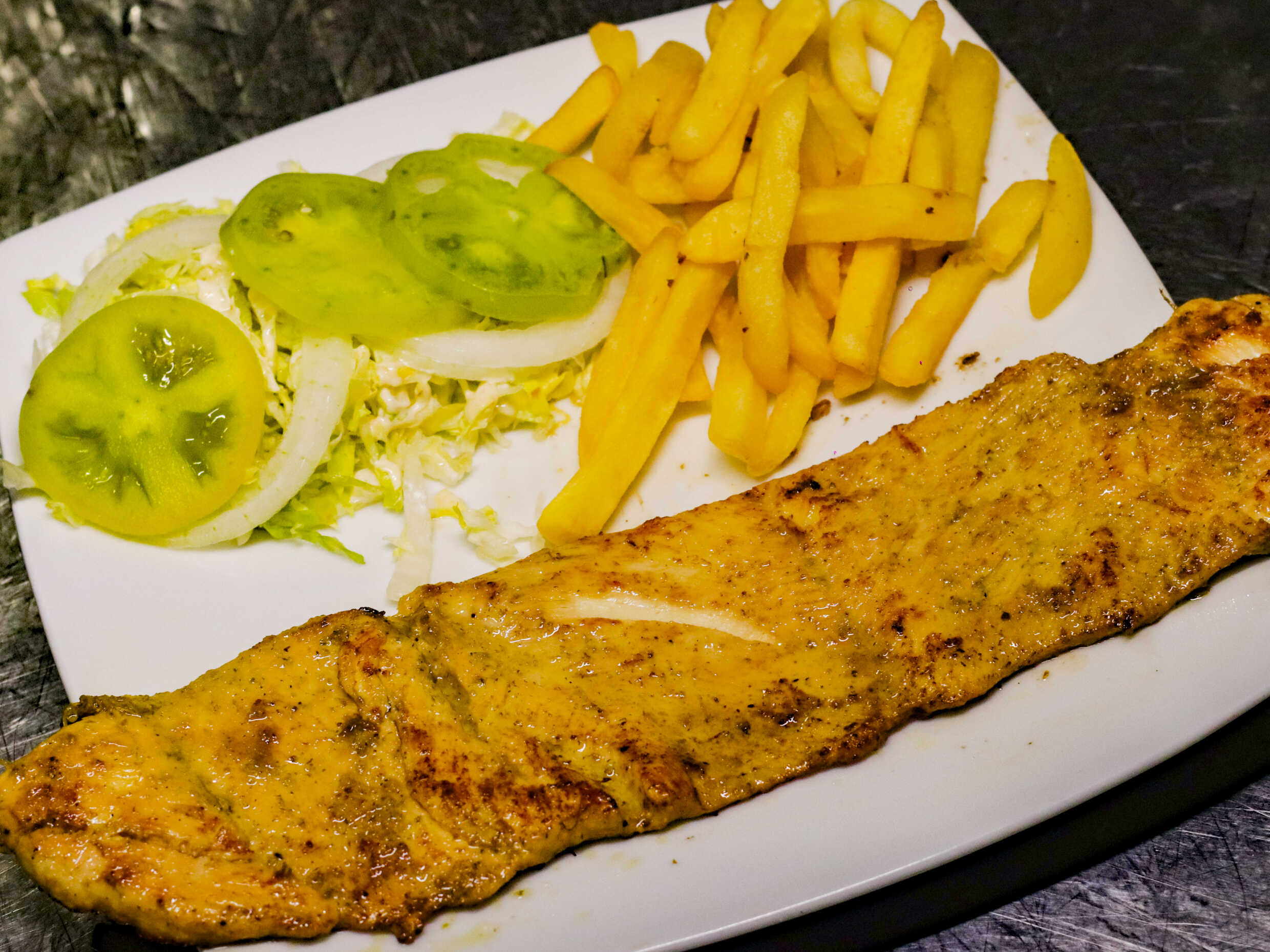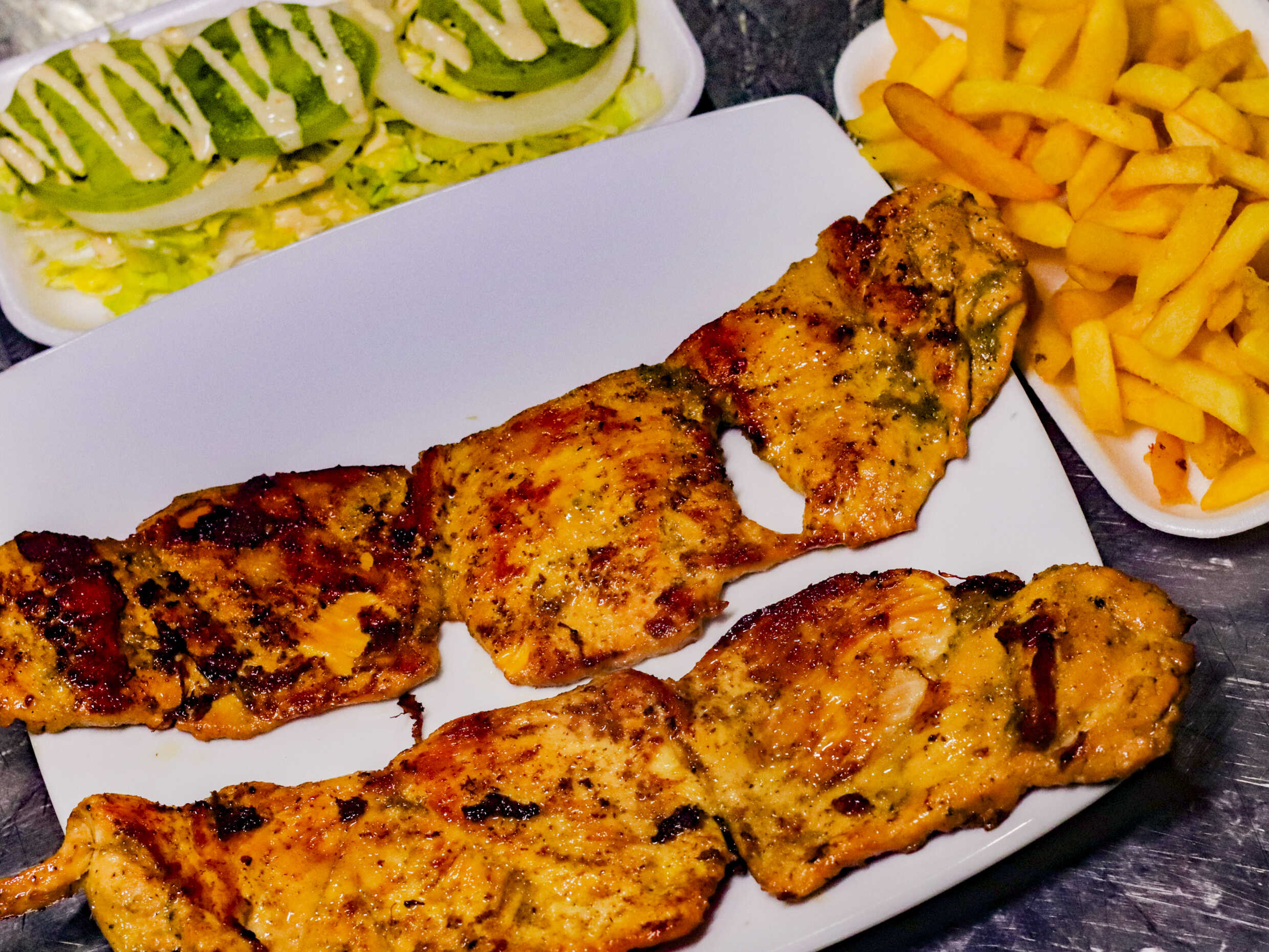 Pechuga de pollo al carbón, papas a la francesa y ensalada de la casa.