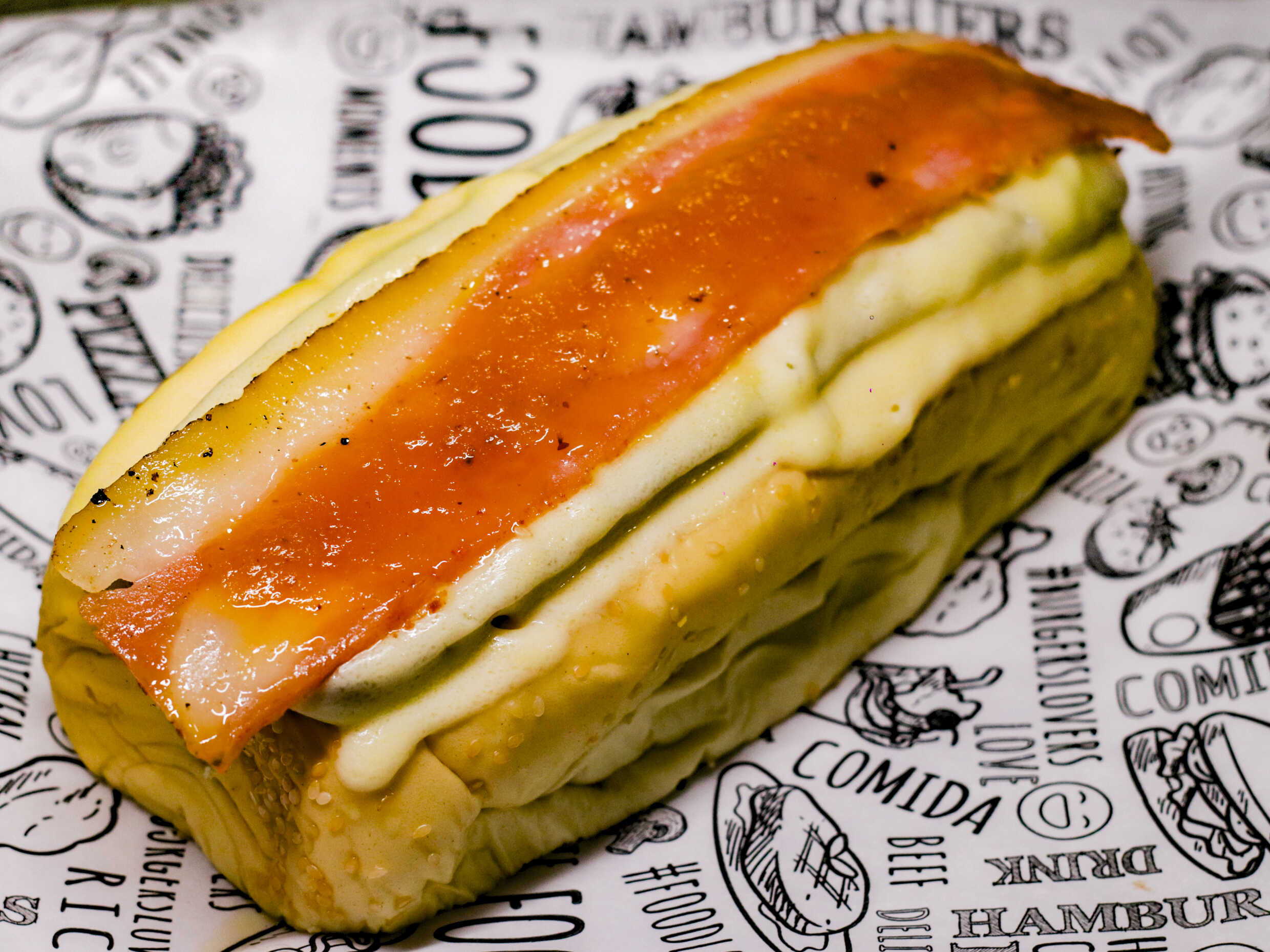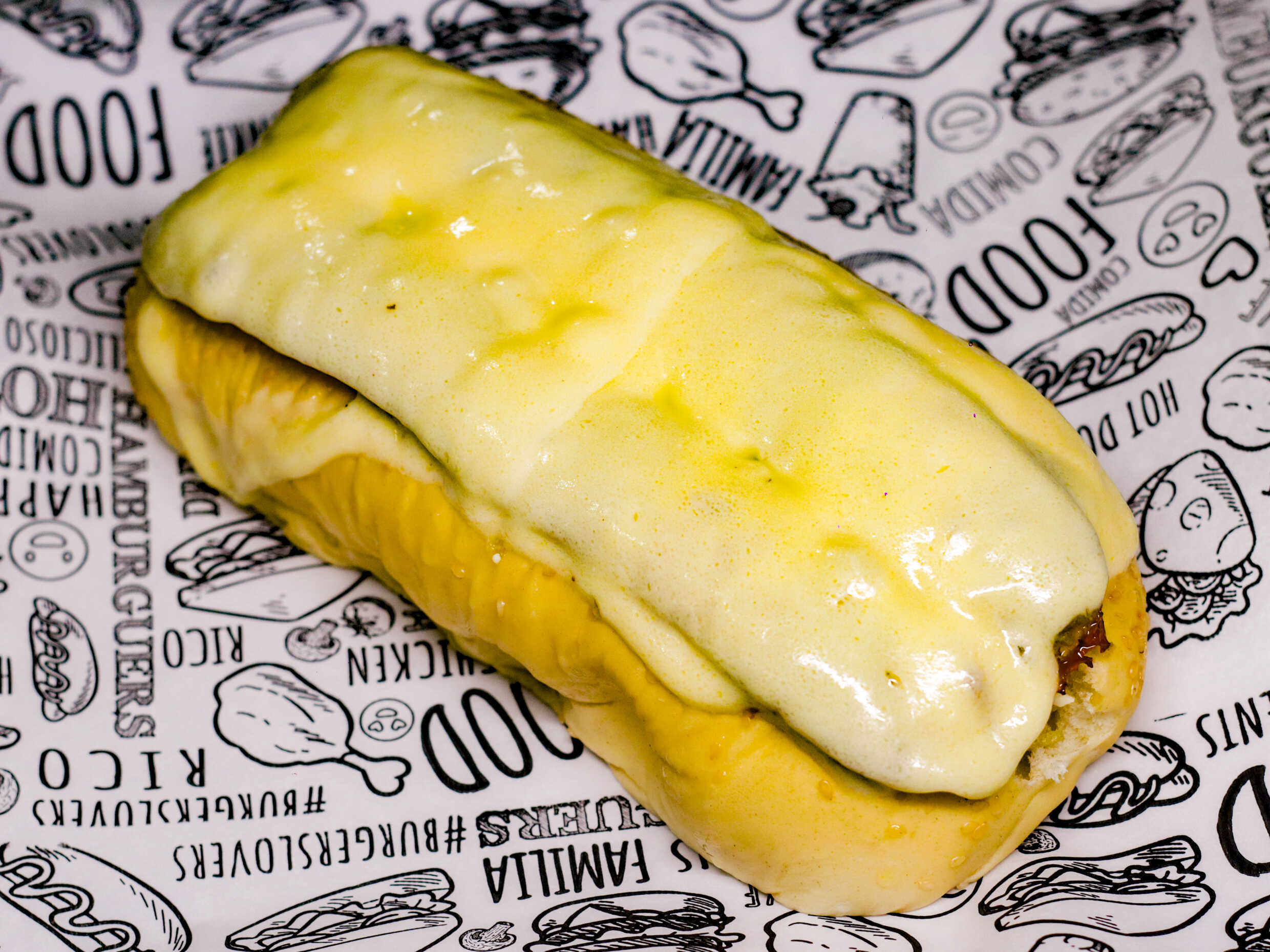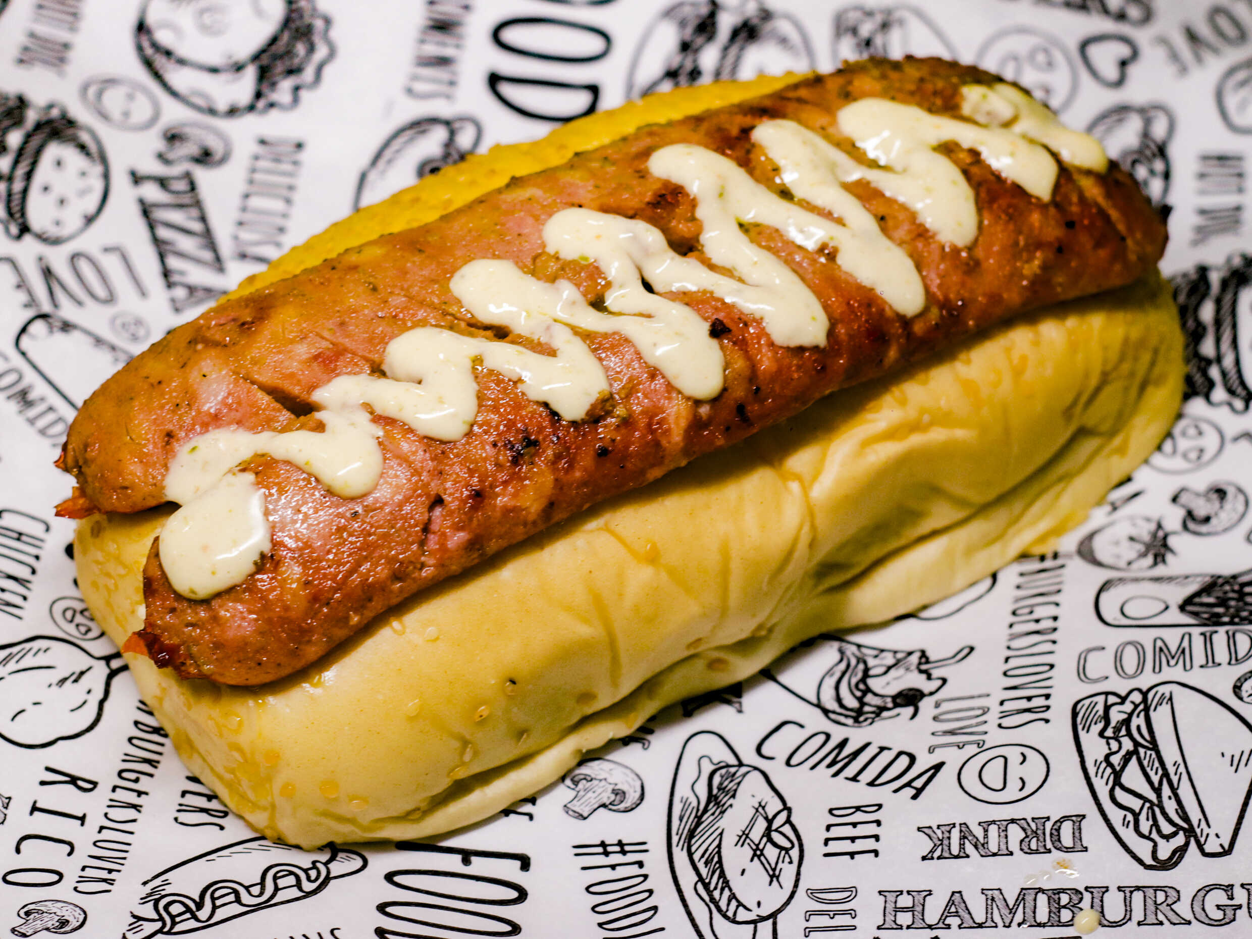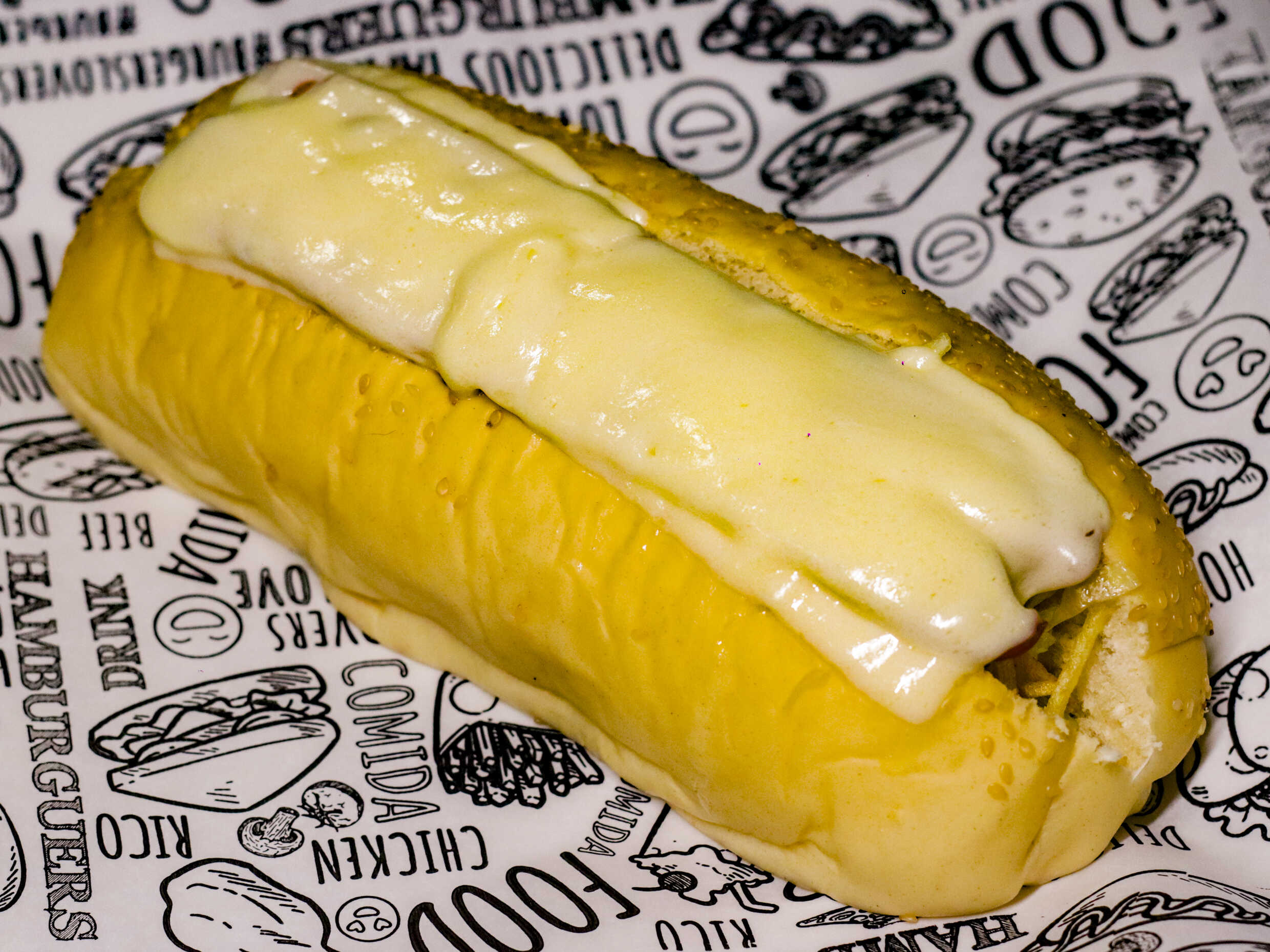 Pan perro, chorizo, pollo, queso mozzarella, lechuga o cebolla, papa chongo y piña o tártara.