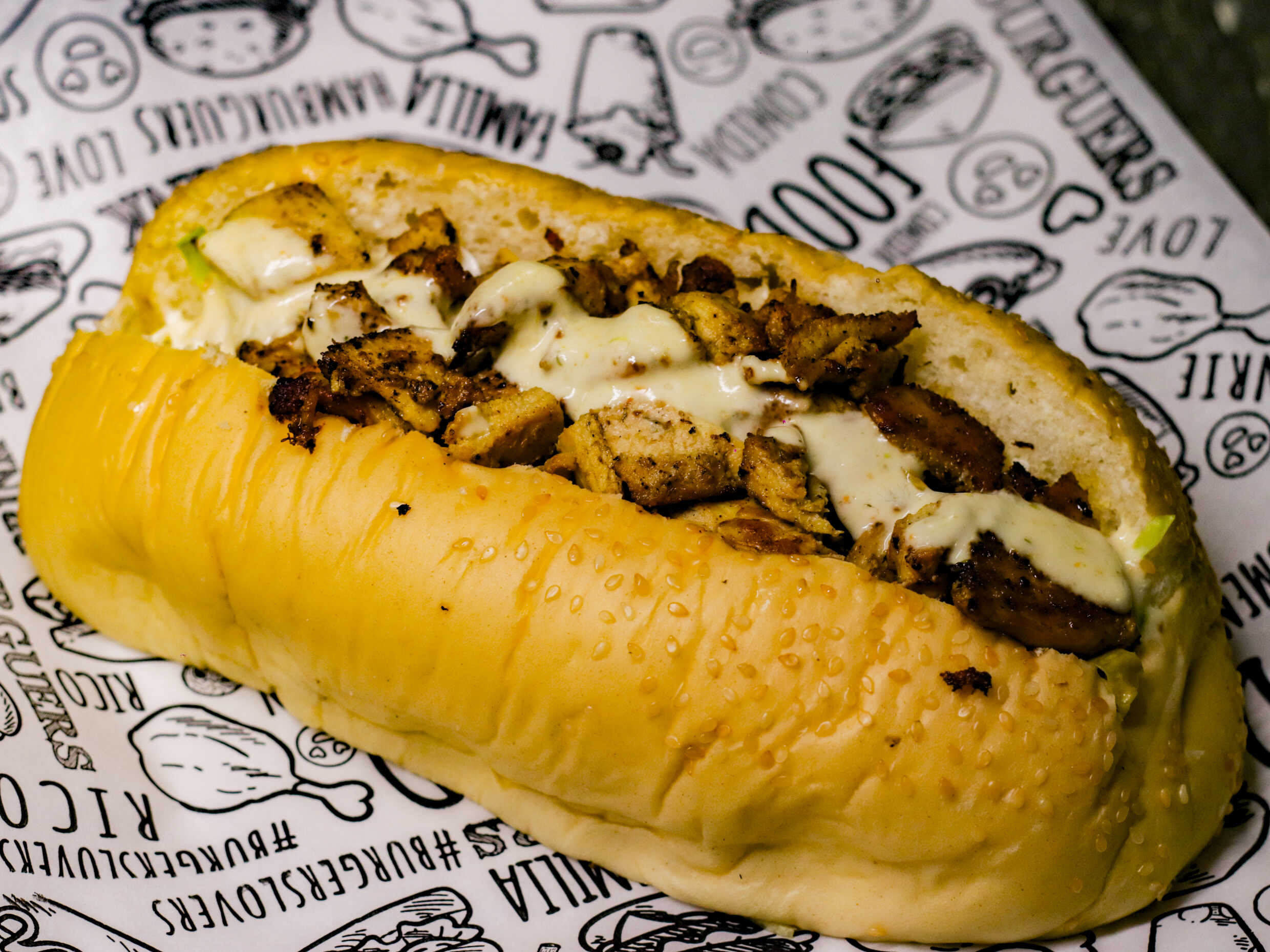 Pan, lomito, pollo, tomate, lechuga, queso mozzarella y salsa de la casa.