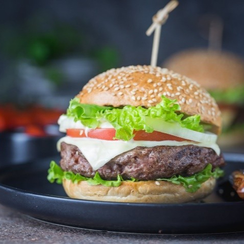 ¡Dos hamburguesas!, dos panes artellano con carne de res hecha al grill, lechuga, tomate y el toque dulce de la cebolla caramelizada.