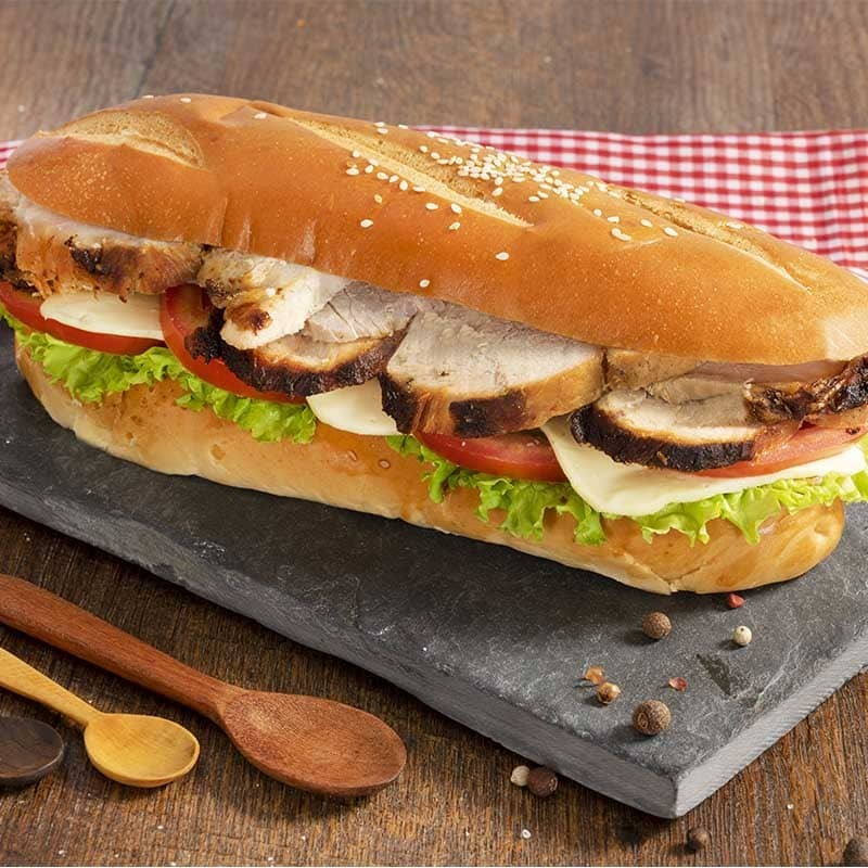Pan artellano tostado a la parrilla, relleno de jugosa bondiola de cerdo hecha al grill, queso americano, lechuga, tomate, cebolla y nuestra especial salsa de la casa.