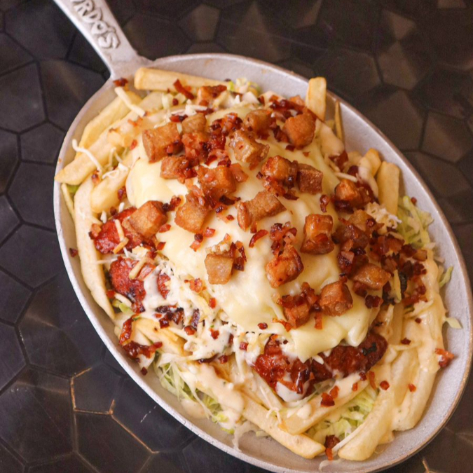 Pulpa de cerdo, salchicha, chorizo argentino en una reduccion de salsa BbQ, con papas fritas, queso fundido, salsa de la casa, coronado con Trozos de Chicharron y tocineta Chunch. Ideal para dos personas
