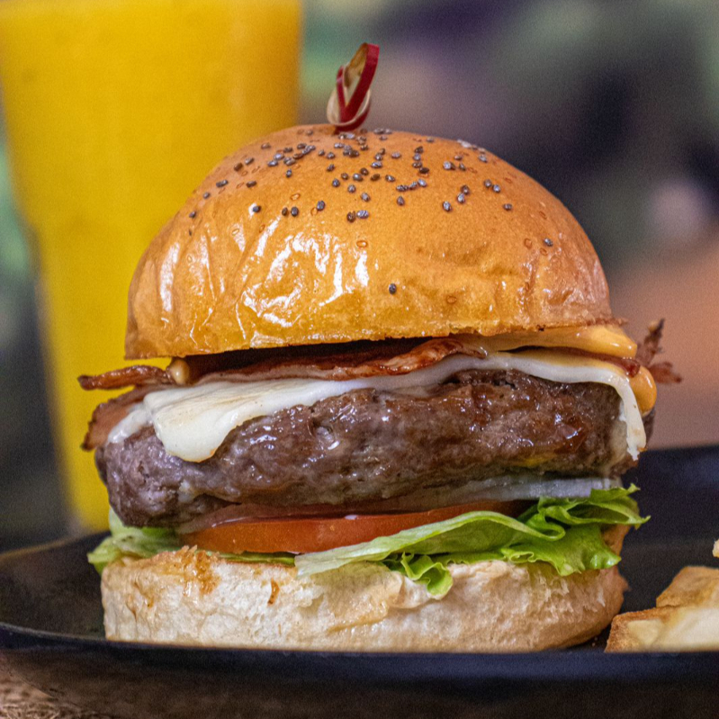 Hamburguesa de Carne, con tocineta, jamon, queso mozarella, vegetales y salsas. Acompañada de papas fritas. Ideal para una persona