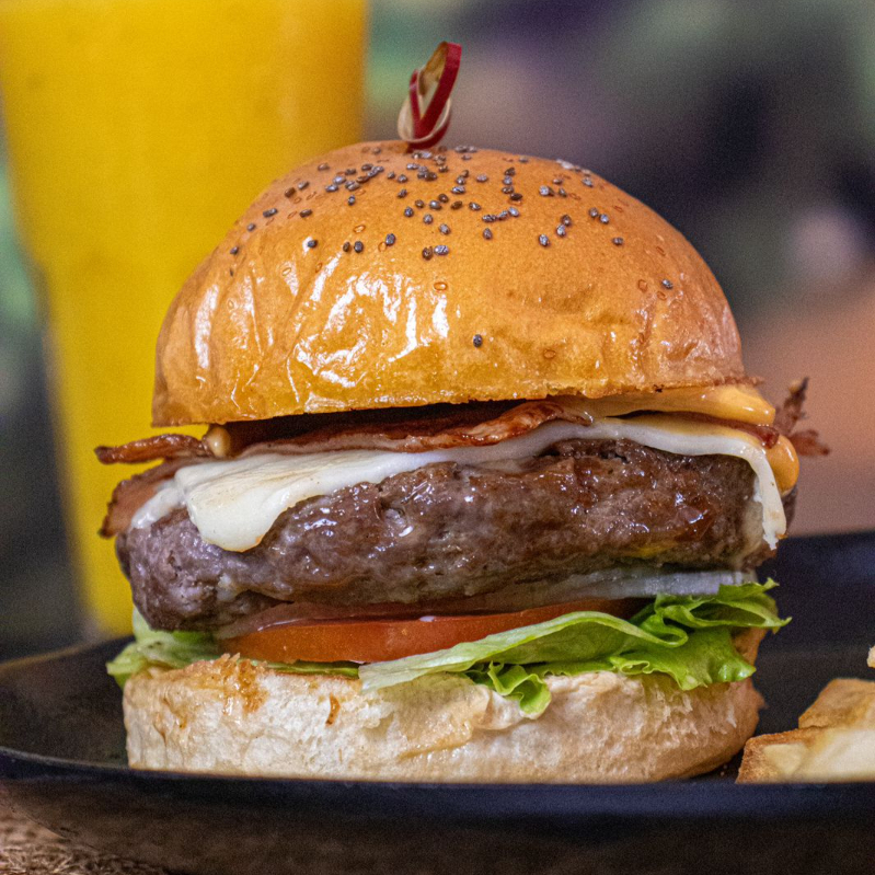 Hamburguesa de Carne, con tocineta, queso fundido, jamon, lechuga, tomate y cebolla. Acompañada de papas fritas.
