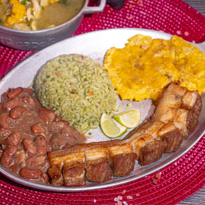 150 gr de pollo 50g de chicharrón, chorizo artesanal, huevo frito, tajada de plátano, arroz del día y Granos (Zaragoza o lentejas depende del día) Acompañado de sopa y bebida 250ml. Disponible de 11:00am a 3:00pm.