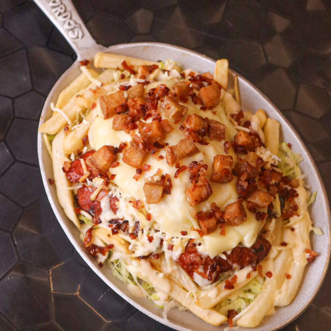 Pulpa de cerdo, salchicha, chorizo argentino en una reduccion de salsa BbQ, con papas fritas, queso fundido, salsa de la casa, coronado con Trozos de Chicharron y tocineta Chunch. Ideal para dos personas