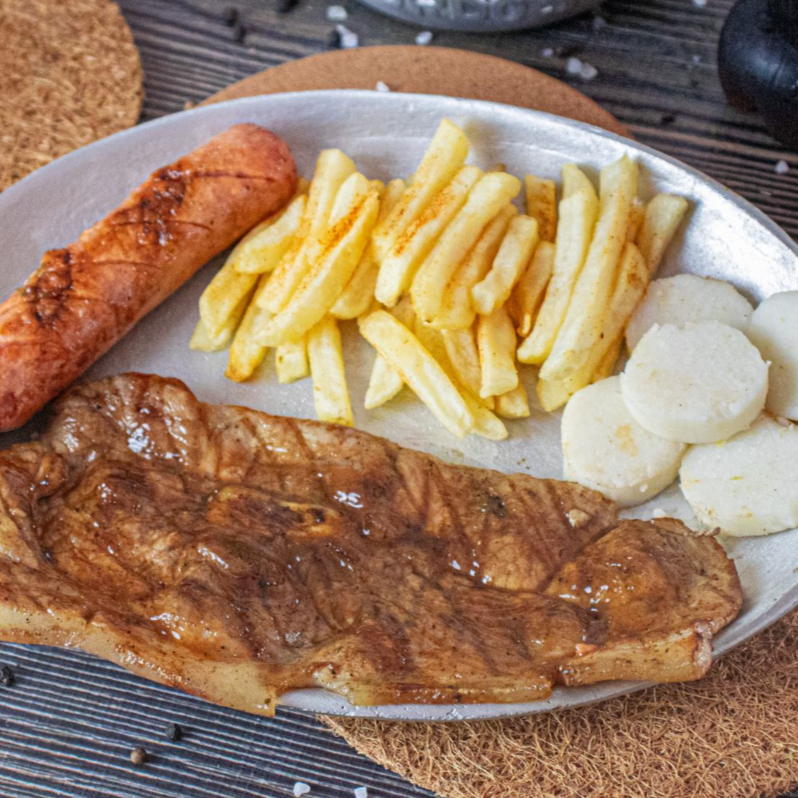150gr de Loncha de Cerdo, chorizo artesanal, papas fritas, bollo limpio, ensalada, no trae sopa y gaseosa (Disponible Coca-cola zero o agua manzana)