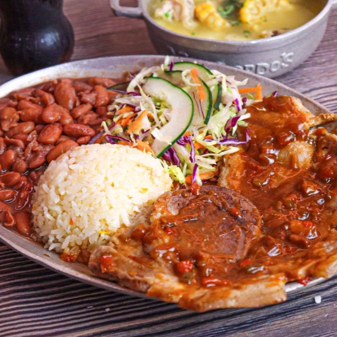 150 gr de carne, 50g de chicharrón, chorizo artesanal, huevo frito, tajada de plátano, arroz del día y Granos (Zaragoza o lentejas depende del día) Acompañado de sopa y bebida 250ml. Disponible de 11:00am a 3:00pm.