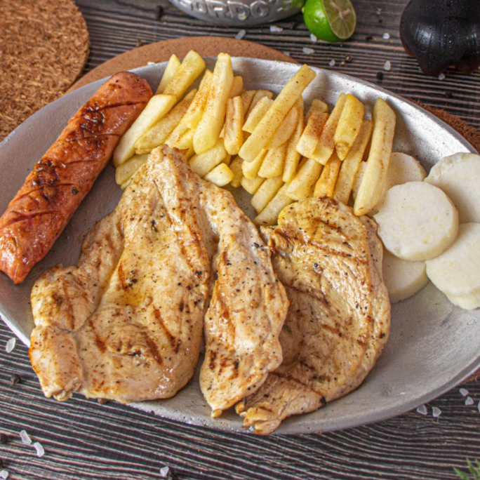 150gr de Pechuga,chorizo artesanal, papas fritas, bollo limpio, ensalada, no trae sopa y gaseosa (Disponible Coca-cola zero o agua manzana)