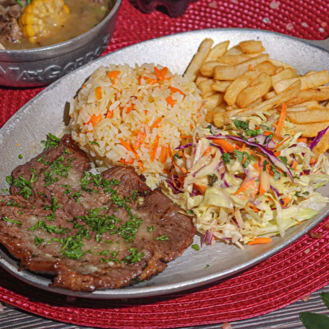 150 gr de carne, 50g de chicharrón, chorizo artesanal, huevo frito, tajada de plátano, arroz del día y Granos (Zaragoza o lentejas depende del día) Acompañado de sopa y bebida 250ml. Disponible de 11:00am a 3:00pm.