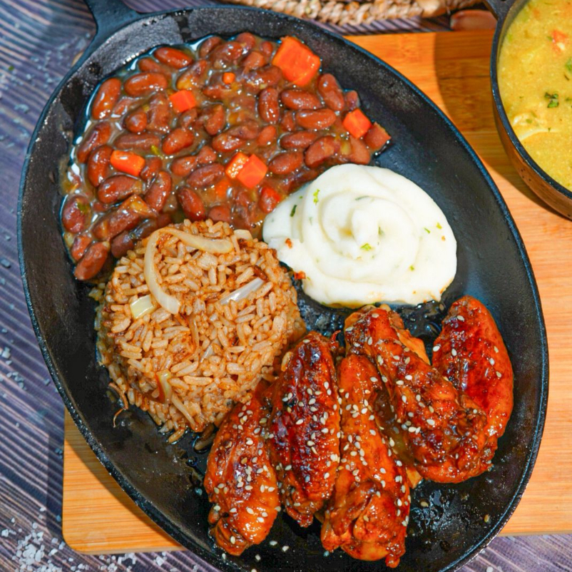 4 Alitas en salsa BBQ , 50g de chicharrón, chorizo artesanal, huevo frito, tajada de plátano, arroz del día y Granos (Zaragoza o lentejas depende del día) Acompañado de sopa y bebida 250ml. Disponible de 11:00am a 3:00pm.
