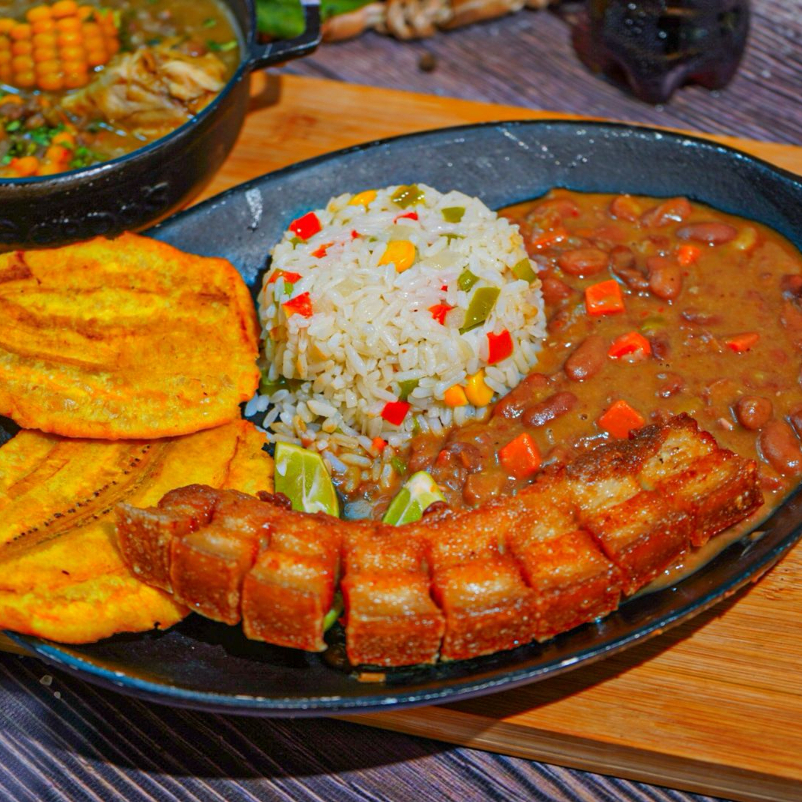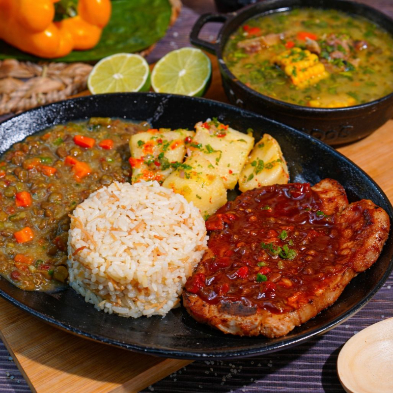 150 gr de pollo, 50g de chicharrón, chorizo artesanal, huevo frito, tajada de plátano, arroz del día y Granos (Zaragoza o lentejas depende del día) Acompañado de sopa y bebida 250ml. Disponible de 11:00am a 3:00pm.