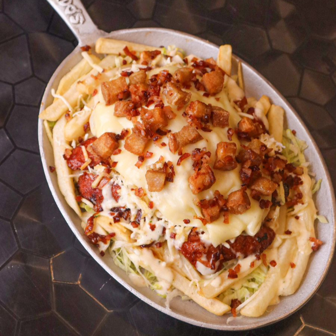 Pulpa de cerdo, salchicha, chorizo argentino en una reduccion de salsa BbQ, con papas fritas, queso fundido, salsa de la casa, coronado con Trozos de Chicharron y tocineta Chunch. Ideal para dos personas