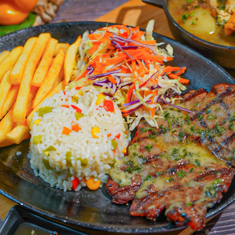carne, pollo, chorizo artesanal salteado en trozos de cebolla. Acompañado de papas fritas. croquetas de yuca, bollo y 4 mazorcas dulces. Ideal para 2 personas