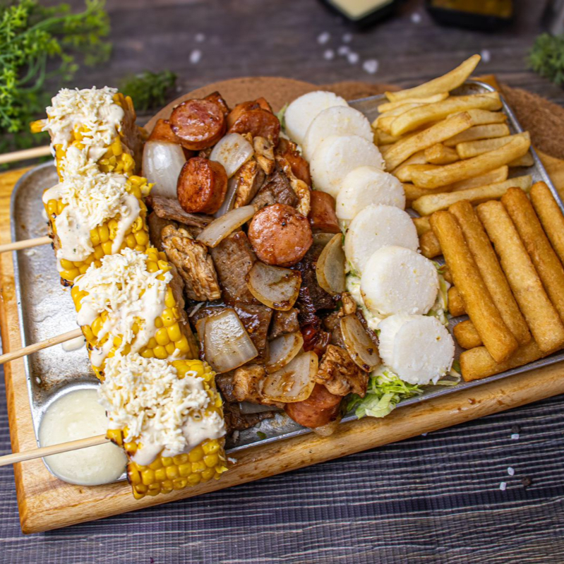 carne, pollo, chorizo artesanal salteado en trozos de cebolla. Acompañado de papas fritas. croquetas de yuca, bollo y 4 mazorcas dulces. Ideal para 2 personas