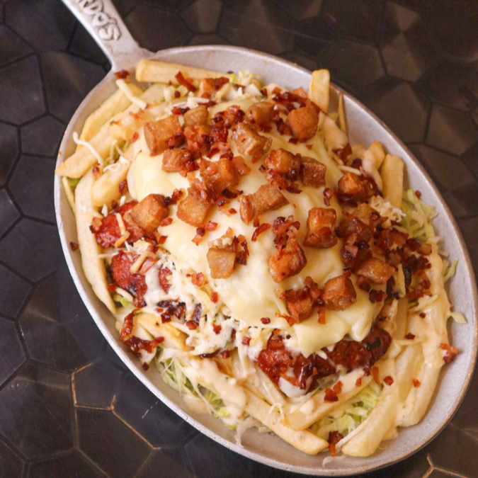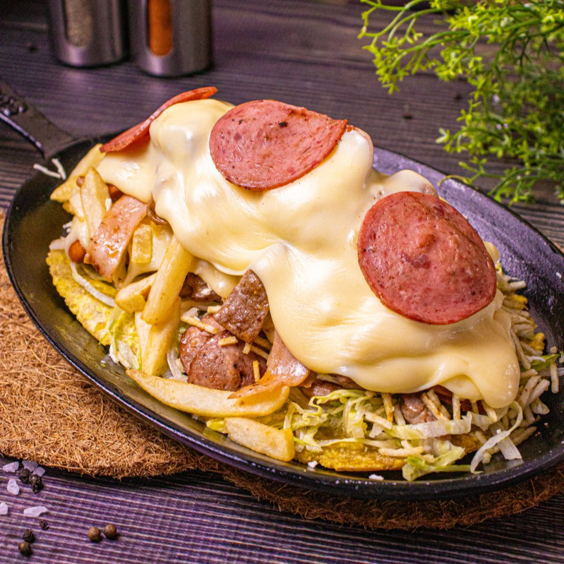 Pulpa de cerdo, salchicha, chorizo argentino en una reduccion de salsa BbQ, con papas fritas, queso fundido, salsa de la casa, coronado con Trozos de Chicharron y tocineta Chunch. Ideal para dos personas