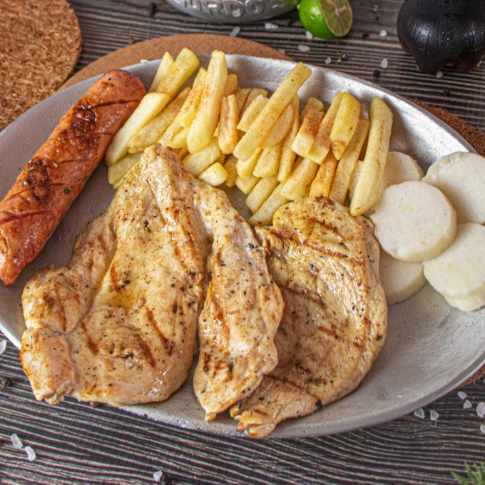 150gr de Pechuga asada, chorizo artesanal, papas fritas, bollo limpio, ensalada, no trae sopa y gaseosa (Disponible coca cola zero o agua manzana)