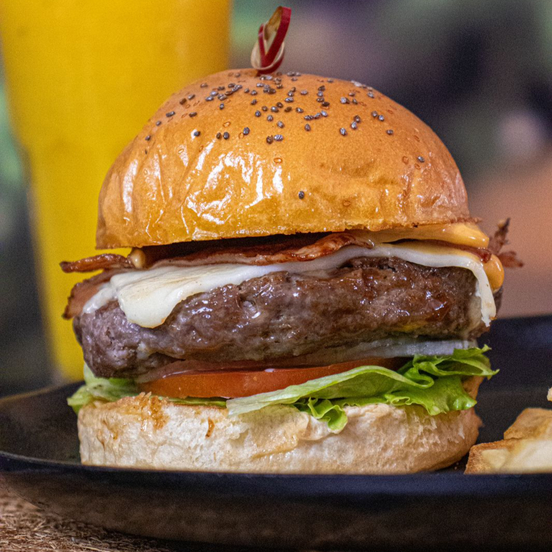 Hamburguesa de carne, con tocineta, queso fundido, jamon, lechuga, tomate y cebolla. Acompañada de papas fritas.