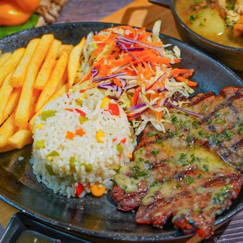 carne, pollo, chorizo artesanal salteado en trozos de cebolla. Acompañado de papas fritas. croquetas de yuca, bollo y 4 mazorcas dulces. Ideal para 2 personas