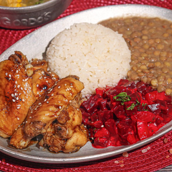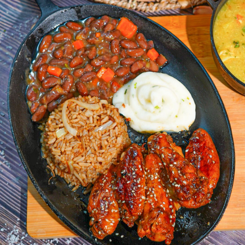 4 Alitas en salsa BBQ, 50g de chicharrón, chorizo artesanal, huevo frito, tajada de plátano, arroz del día y Granos (Zaragoza o lentejas depende del día) Acompañado de sopa y bebida 250ml. Disponible de 11:00am a 3:00pm.