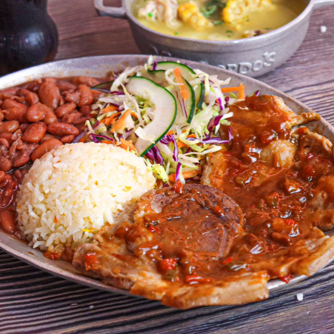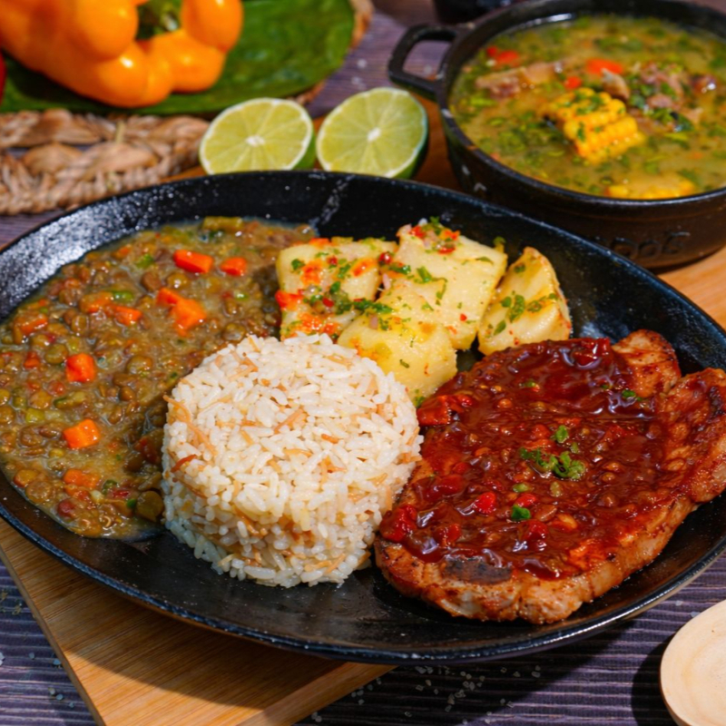 150 gr de pollo, 50g de chicharrón, chorizo artesanal, huevo frito, tajada de plátano, arroz del día y Granos (Zaragoza o lentejas depende del día) Acompañado de sopa y bebida 250ml. Disponible de 11:00am a 3:00pm.