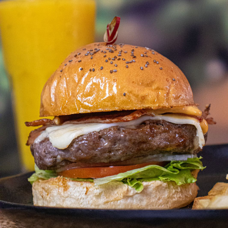 Hamburguesa de carne, con tocineta, queso fundido, jamon, lechuga, tomate y cebolla. Acompañada de papas fritas.