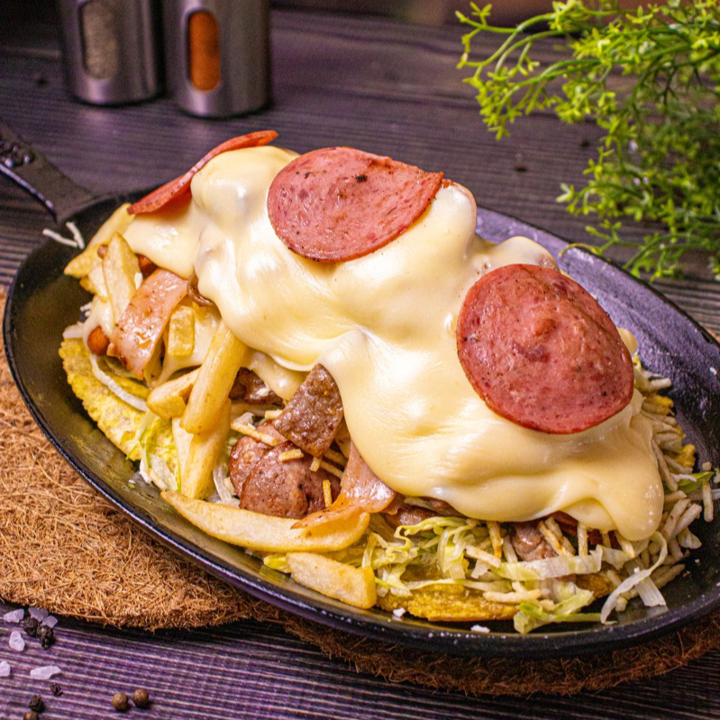 Pulpa de cerdo, salchicha, chorizo argentino en una reduccion de salsa BbQ, con papas fritas, queso fundido, salsa de la casa, coronado con Trozos de Chicharron y tocineta Chunch. Ideal para dos personas