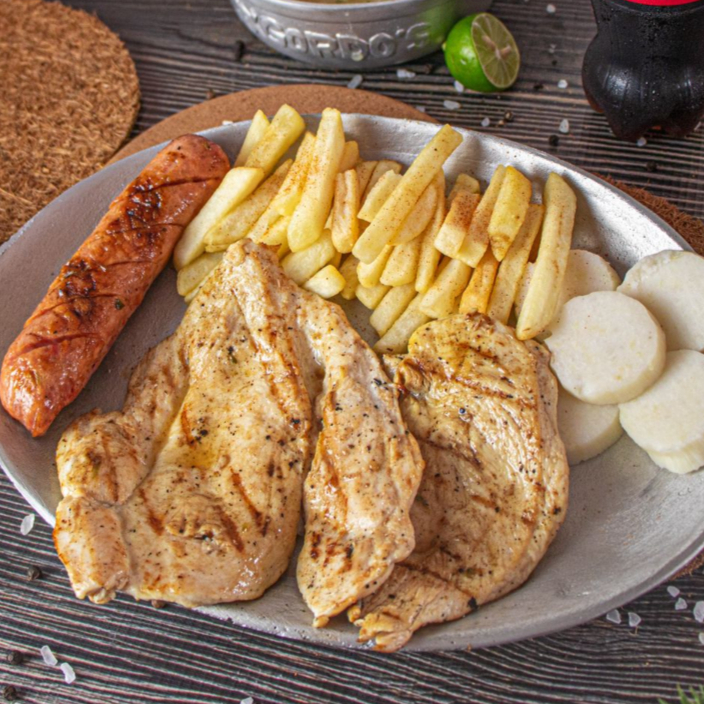 Pollo, trozos de salchichas, papas fritas, queso costeño, lechuga, papas ralladas, salsa tártara y salsa rosada. Ideal para 1 persona.