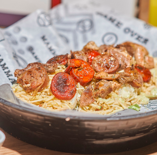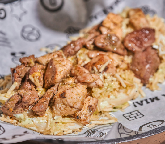 100 g De pollo pechuga y 100 g de lomito, acompañado de bollo, papita de perro, lechuga, queso costeño y salsa Mario Bross.