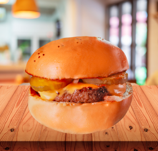 Pan de chía, 150 g de carne de res, queso americano amarillo, cebolla en cuadritos, pepino, salsa de tomate y mostaza.