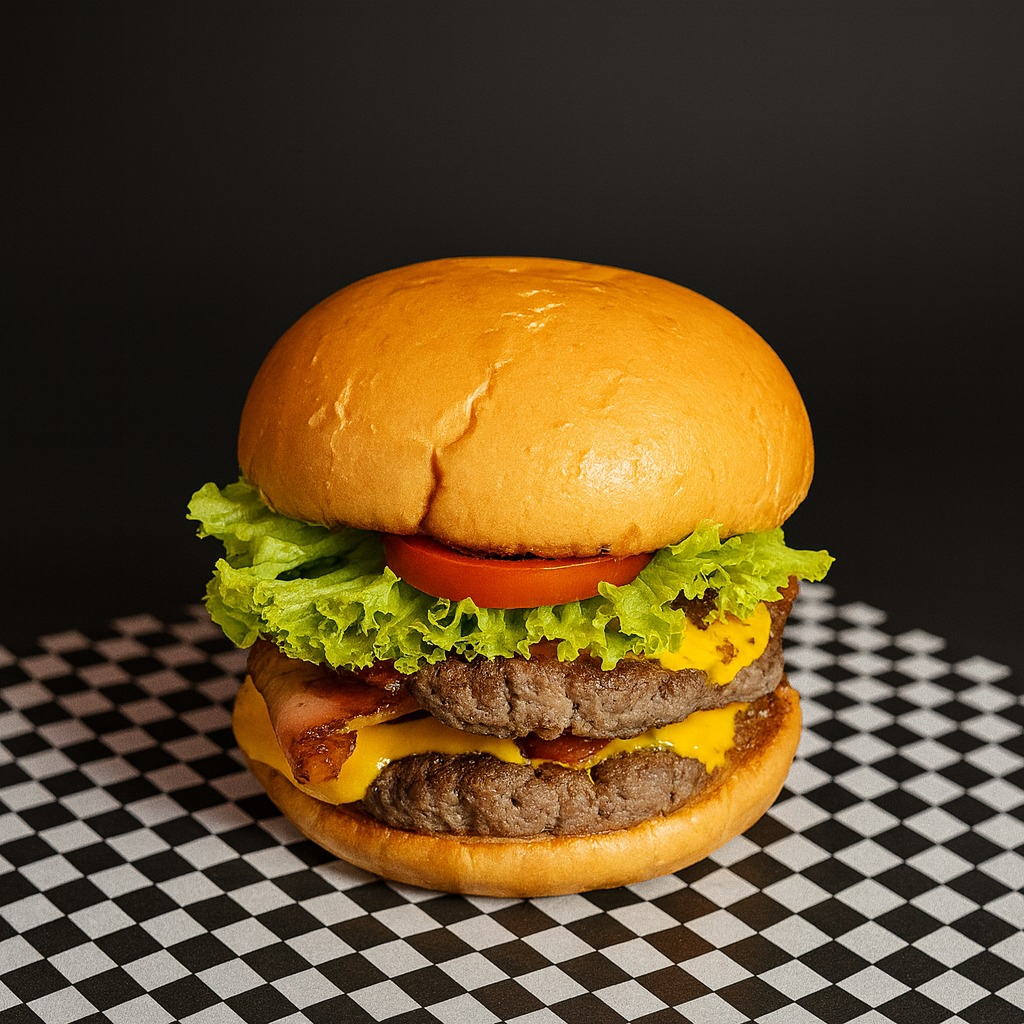 Pan brioche, 2 porciones de 150 gr de carne, queso cheddar, lechuga, tomate, tocineta y salsa MBS