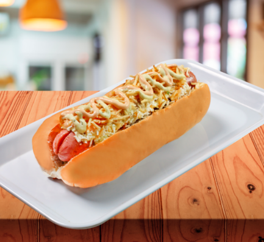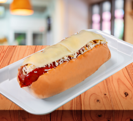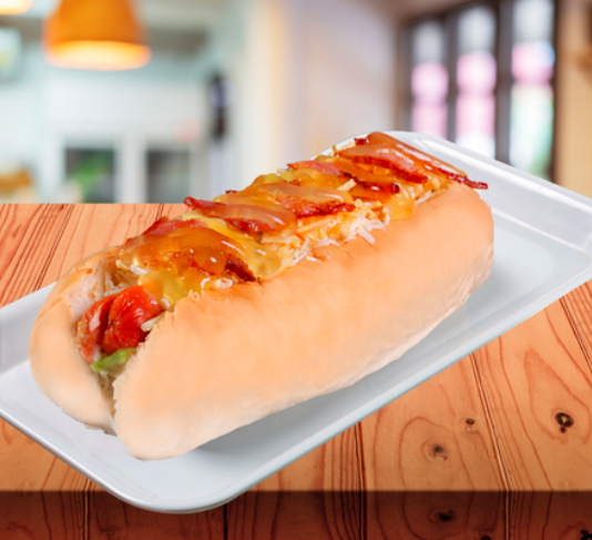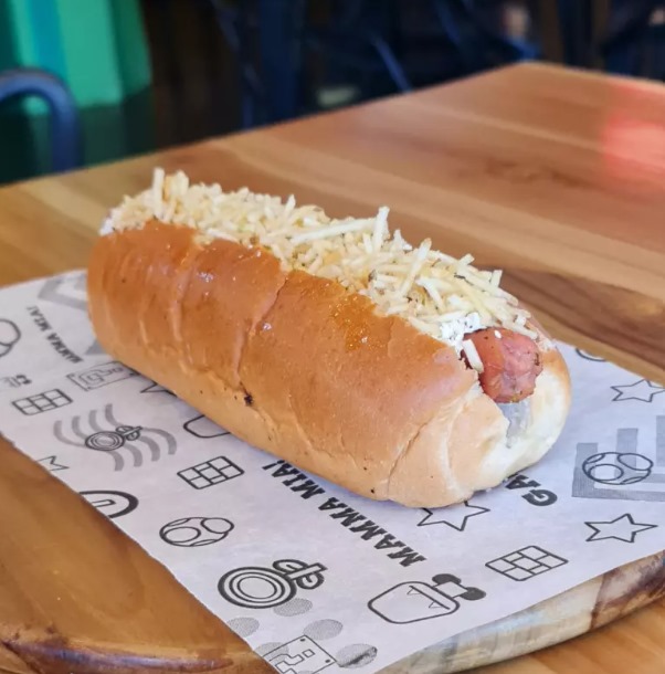 Pan Artesanal, salchicha suiza, queso mozzarella, queso costeño, lechuga, papita de perro y salsa Mario Bross.