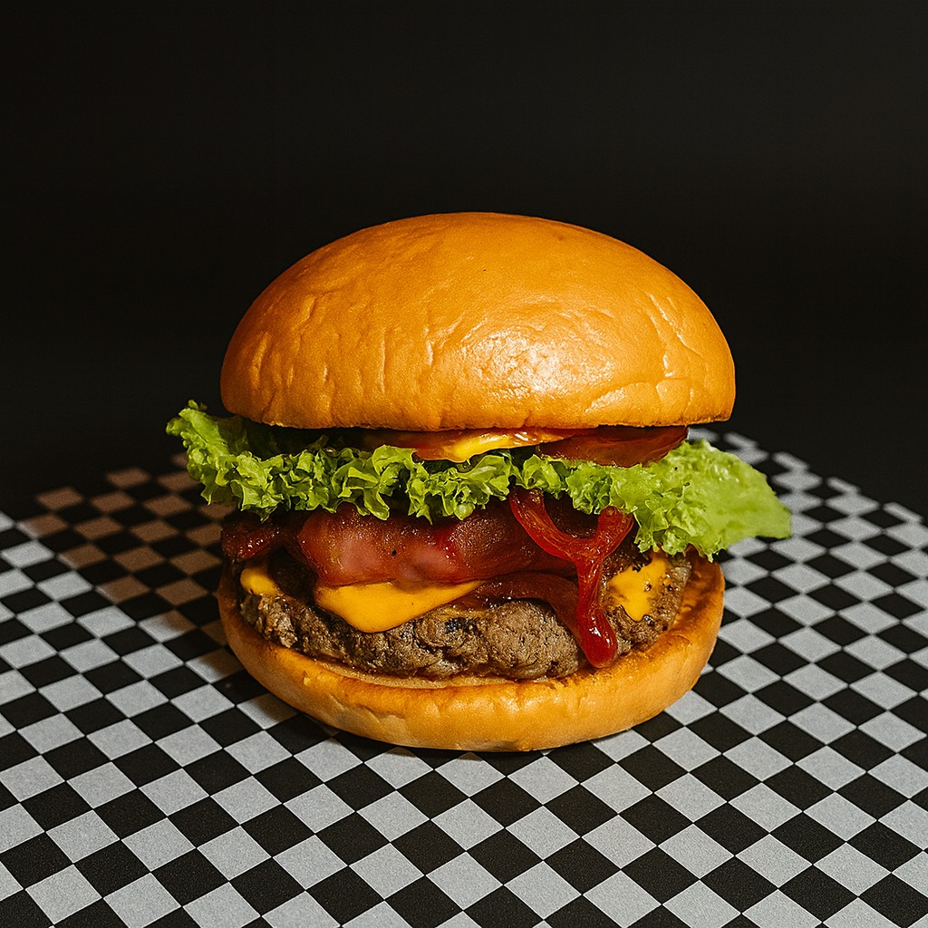Pan brioche, 150 gr de carne, queso cheddar, lechuga, tomate, tocineta y salsa MBS