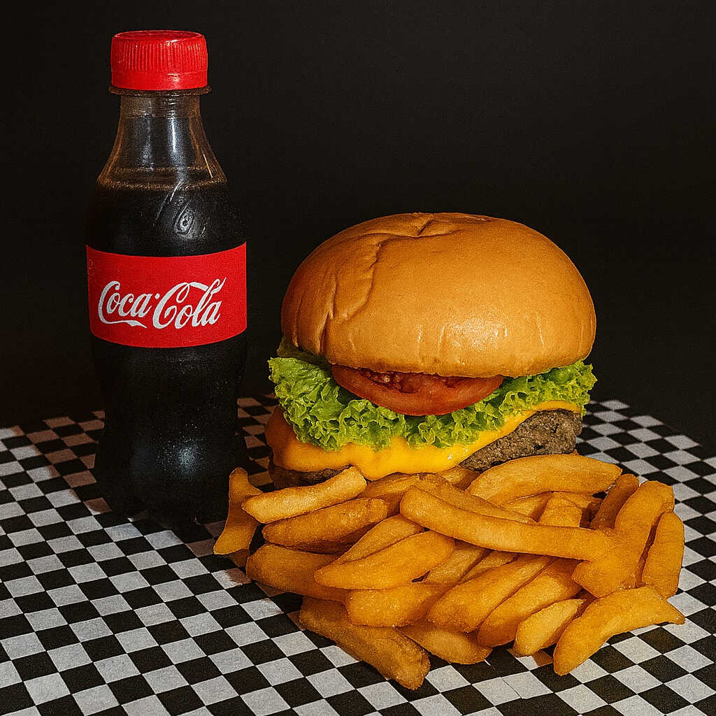 Pan de chía, 150 g de carne de res, cebolla caramelizada, queso holandés, queso costeño, lechuga crespa, salsa mayonesa, y salsa BBQ de la casa. Acompañada de 100 g de papa francesa y Coca-Cola 255 ml.