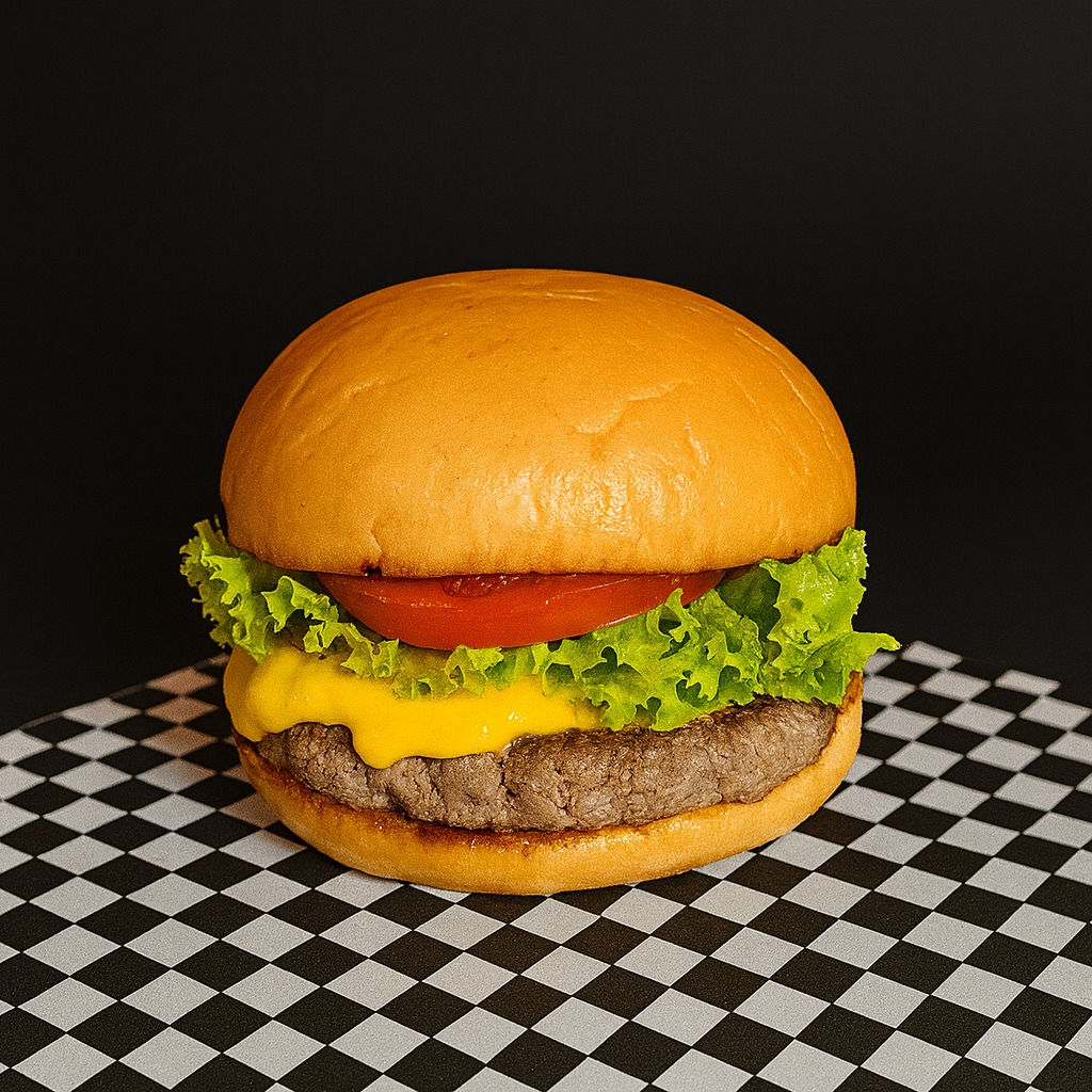 Pan brioche, 150 gr de carne, queso cheddar, lechuga, tomate y salsa MBS