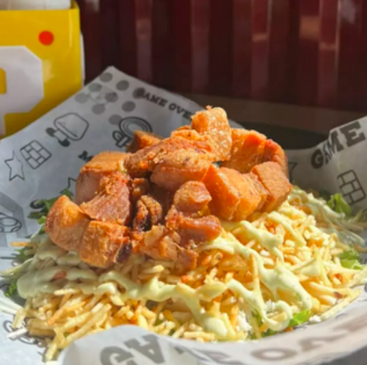 200 g De chicharrón, acompañado de bollo, papita de perro, lechuga queso costeño y salsa Mario Bross.