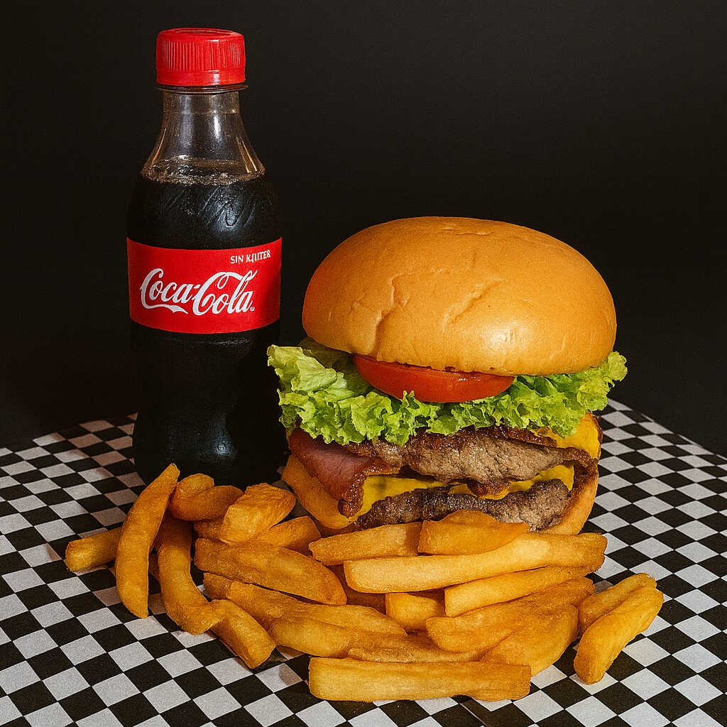 Pan brioche, 2 porciones de 150 gr de carne, queso cheddar, lechuga, tomate, tocineta, salsa MBS, gaseosa 250 ml y 150 gr de papa francesa.