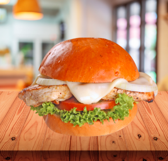 Pan francés, 120 g de pechuga, lechuga crespa, tomate, cebolla bañada en salsa de la casa.
