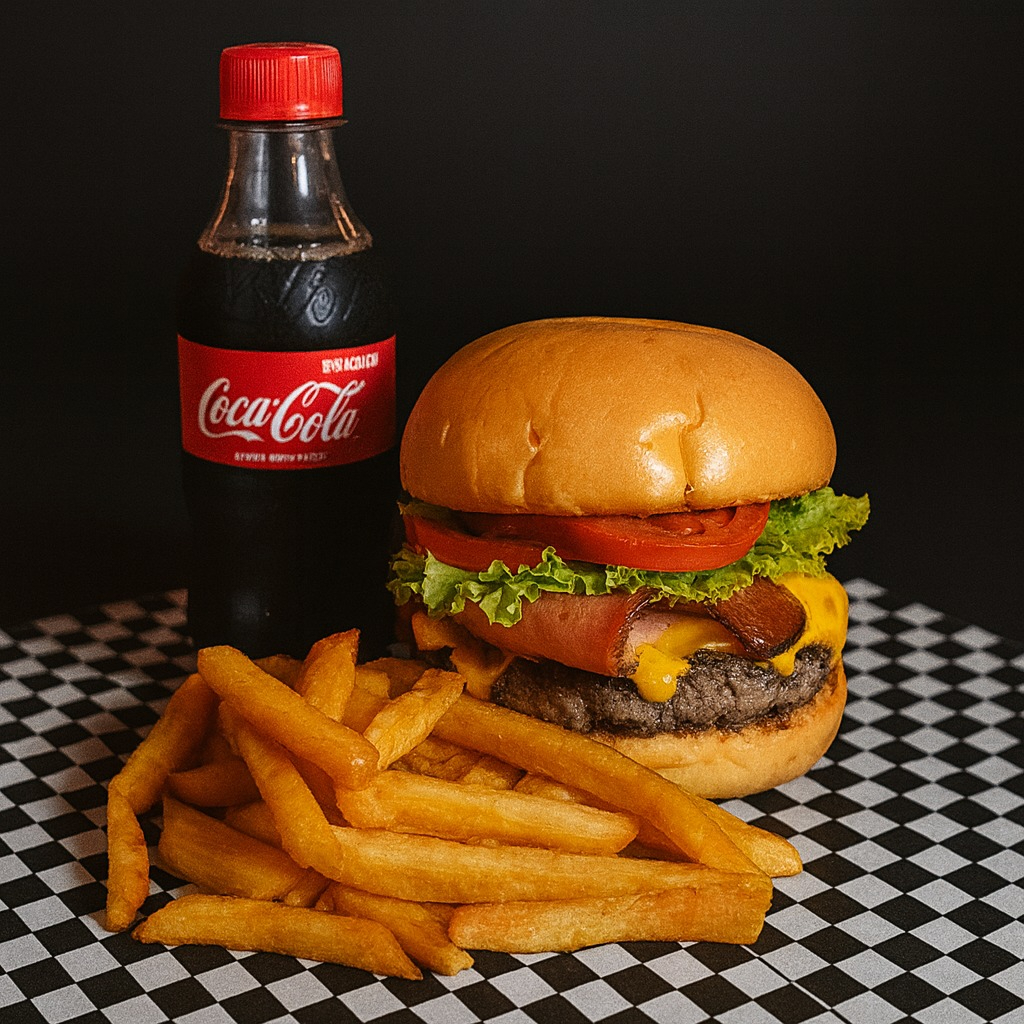Pan brioche, 150 gr de carne, queso cheddar, lechuga, tomate, tocineta salsa MBS + gaseosa 250 ml y 150 gr de papa francesa