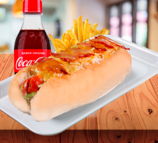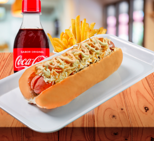 Pan artesanal, salchicha americana, tocineta, queso costeño, papita de perro, lechuga, salsa piña y salsa Mario Bross. Acompañado de 100 g de papa francesa y Coca-Cola 255 ml.