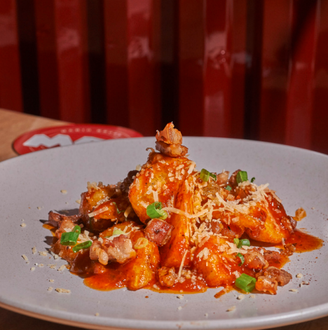He aquí nuestras patatas bravas elaboradas con la salsa que afirman que es una de las auténticas patatas bravas de Madrid, coronadas con trozos de chicharrón crocante y lluvia de que parmesano con paprika.